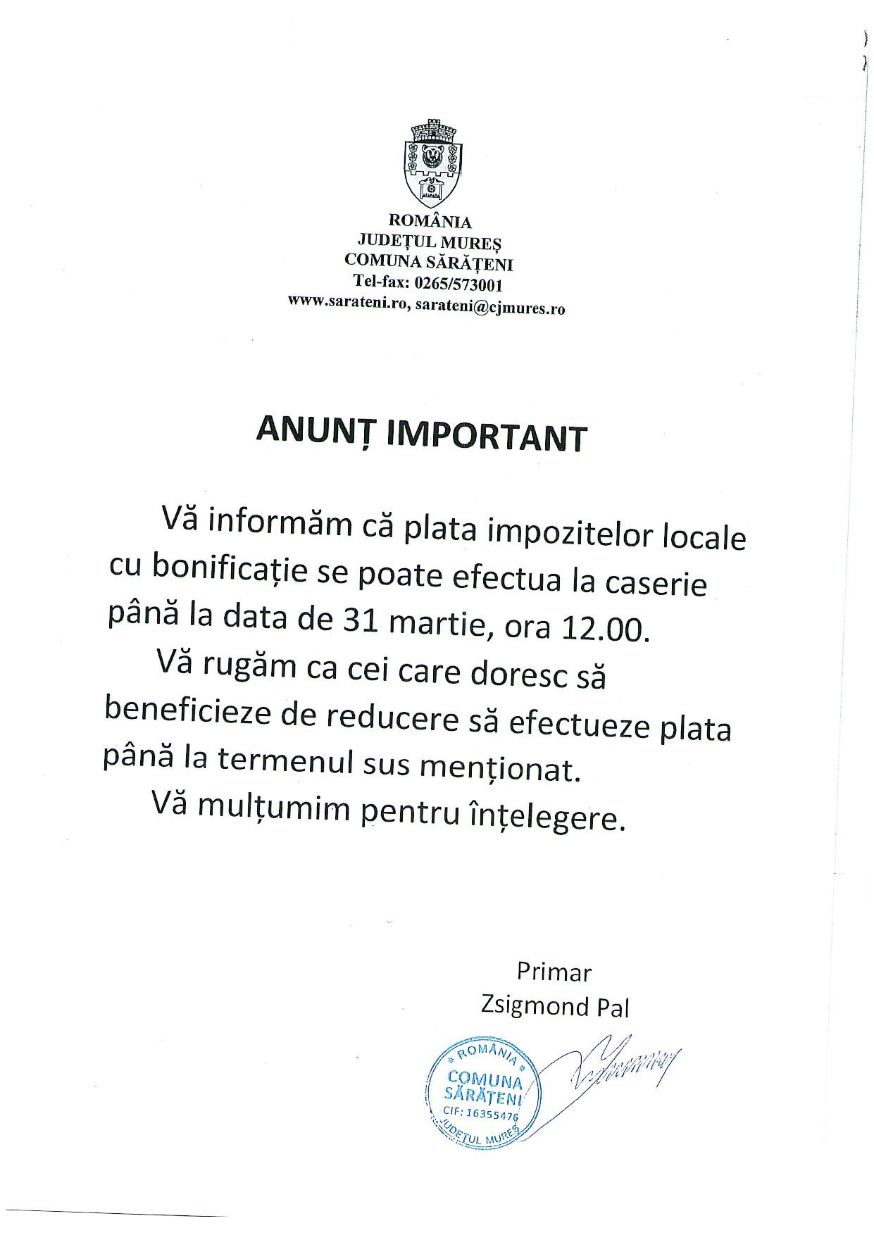 Anunt termen de plata a impozitelor cu bonificatie - RO